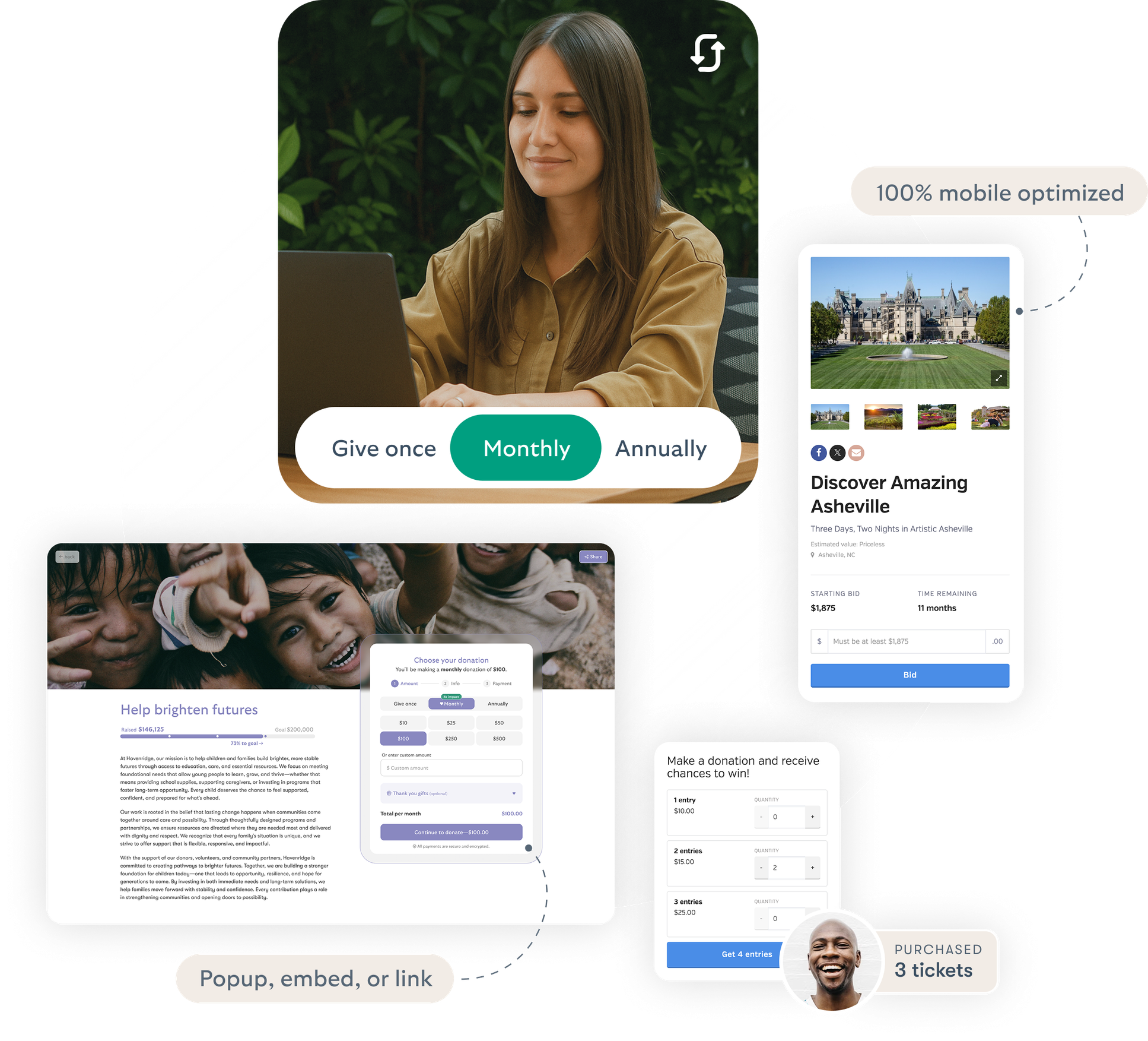 The BetterWorld platform offers a single place to manage every campaign you need to run for your nonprofit. Streamline operations with a central hub for auction, raffles, and ticketing.